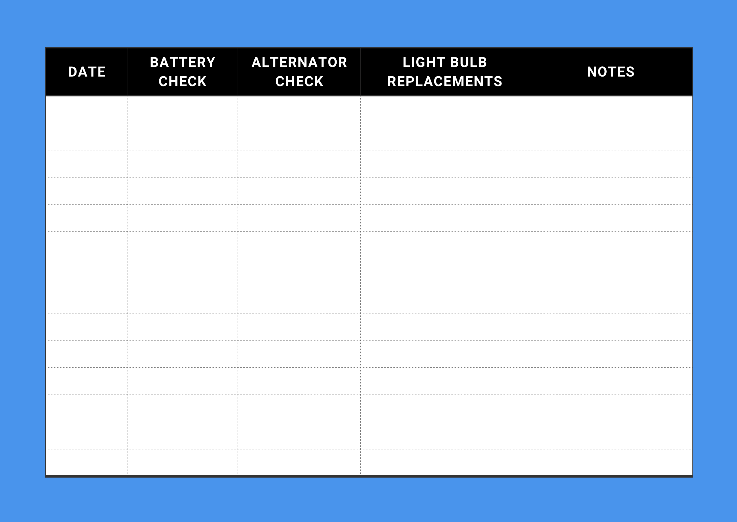 The battery is a crucial component of any vehicle, and monitoring its health is essential. By consistently updating the log with battery maintenance activities, replacements, and tests, you can stay informed about the battery's condition and schedule timely replacements when necessary.
