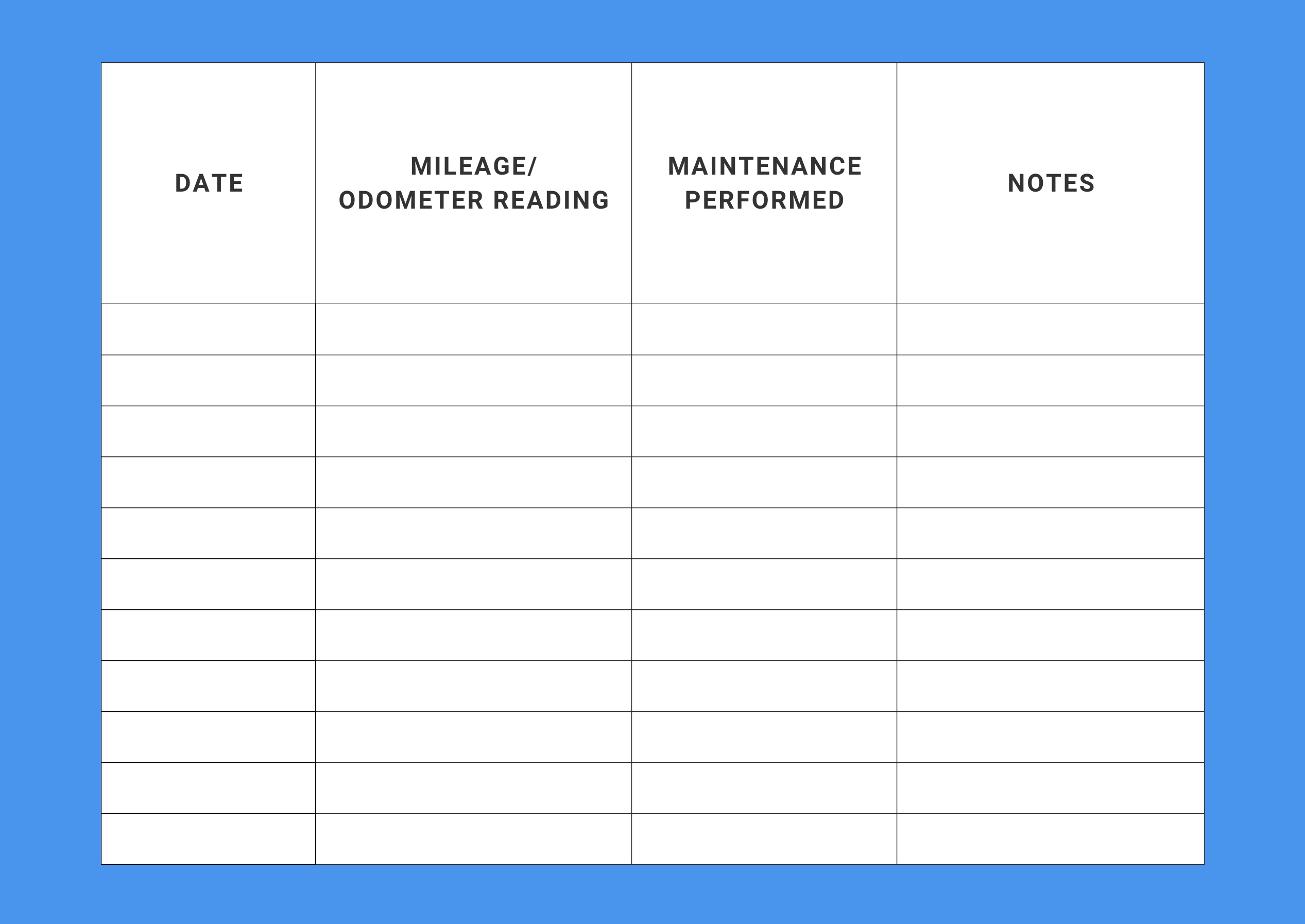 A vehicle maintenance log for mileage or odometer readings allows you to document the mileage at specific intervals, such as during routine maintenance or oil changes. This information provides insights into the vehicle's usage patterns and helps determine when specific maintenance tasks should be performed.