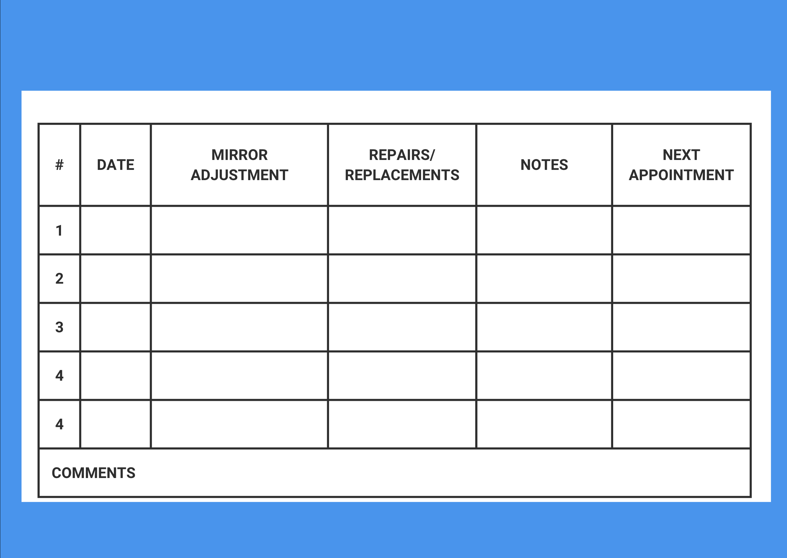 Properly functioning mirrors are crucial for safe trucking. A vehicle maintenance log template for mirrors allows you to track mirror adjustments, repairs, or replacements. By documenting mirror-related maintenance activities, you can ensure that your mirrors are in excellent condition, providing clear visibility and enhancing overall safety on the road.