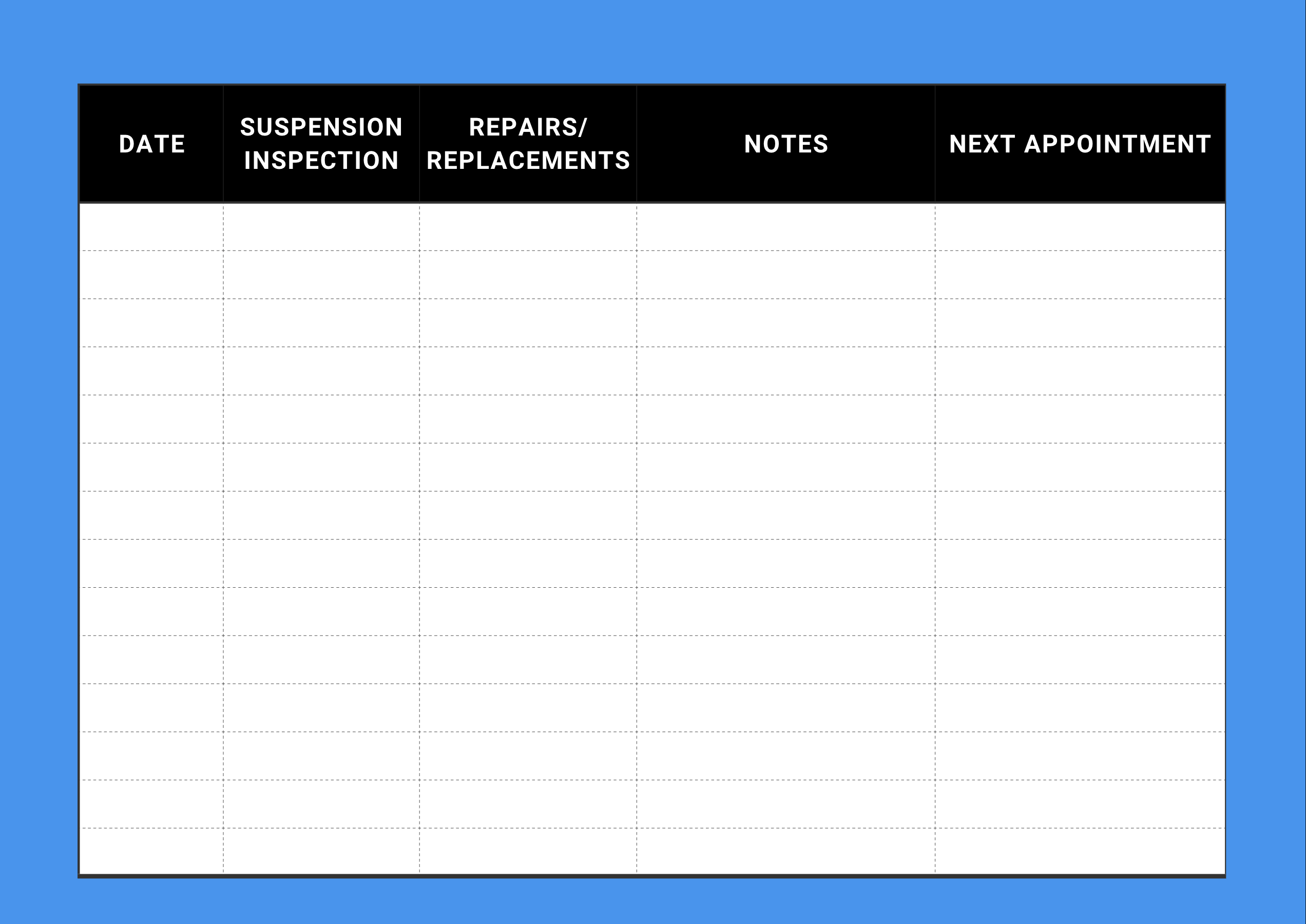 The suspension system plays a vital role in providing a smooth and comfortable ride. By maintaining a detailed log, you can ensure that your vehicle's suspension system is in good working order, enhancing ride quality and safety on the road.
