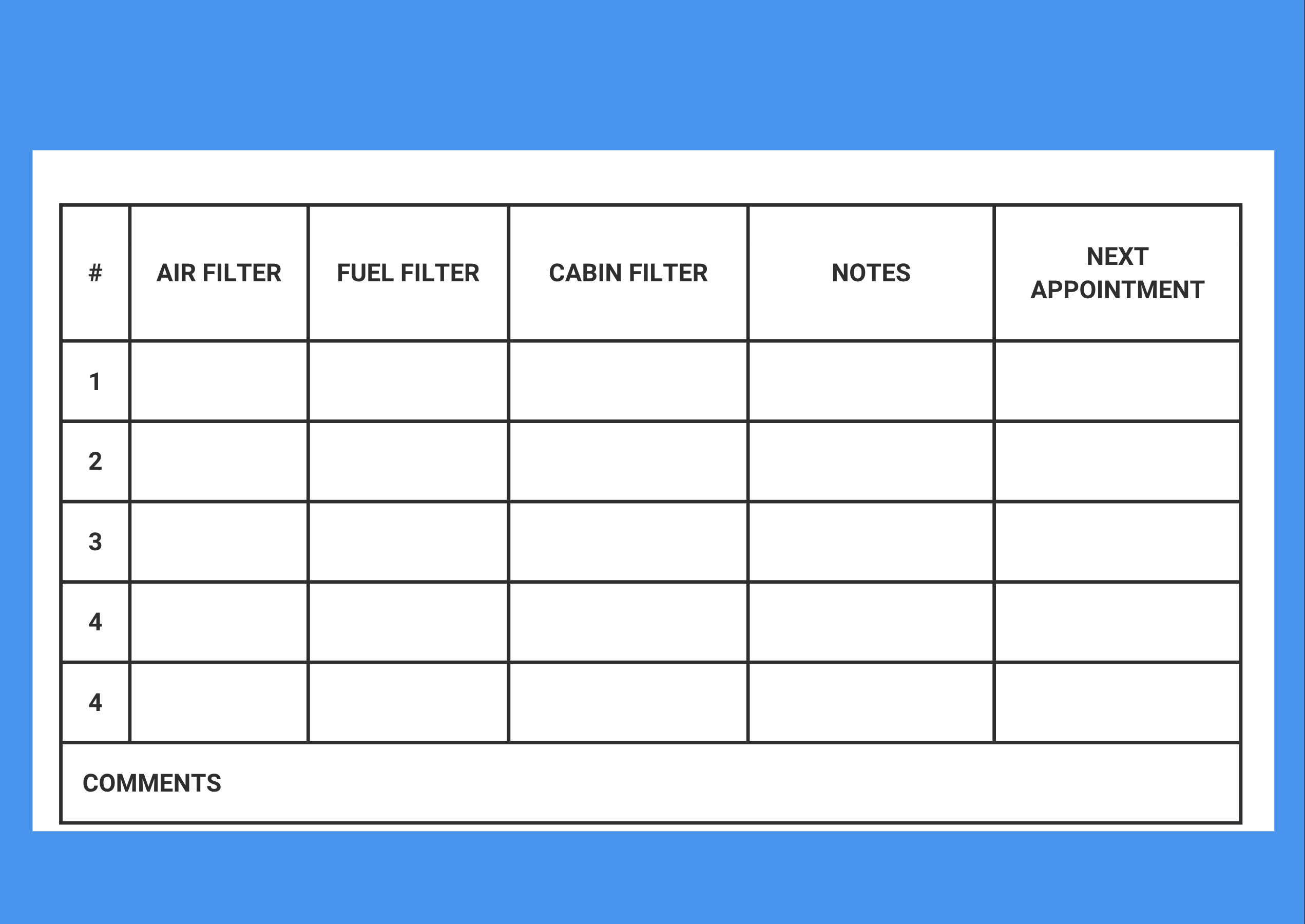 Filters play a vital role in keeping your vehicle's systems clean and efficient. This log template serves as a helpful reference for ensuring timely filter replacements, monitoring the overall condition of your vehicle's filters, and promoting the longevity and efficiency of its systems.